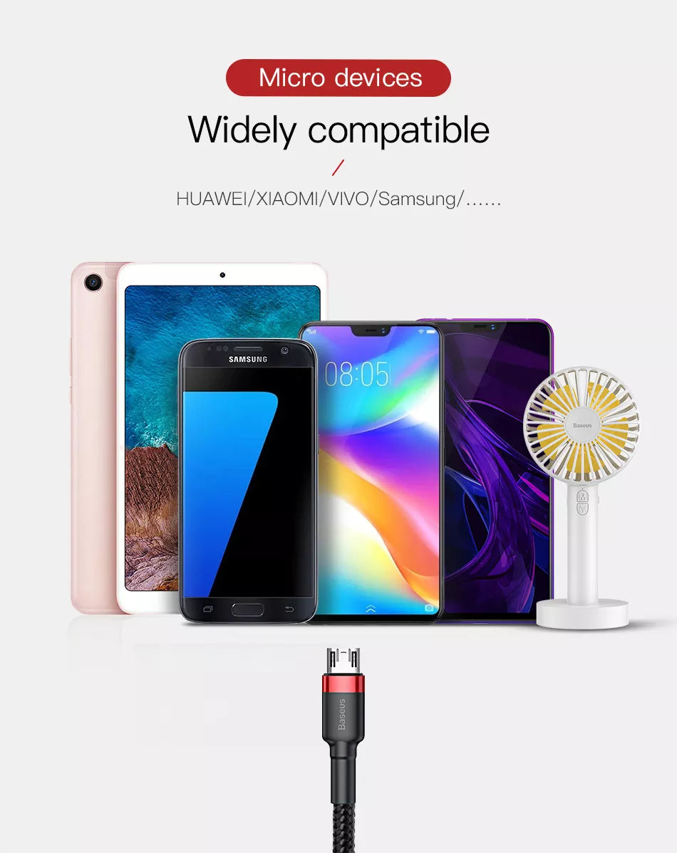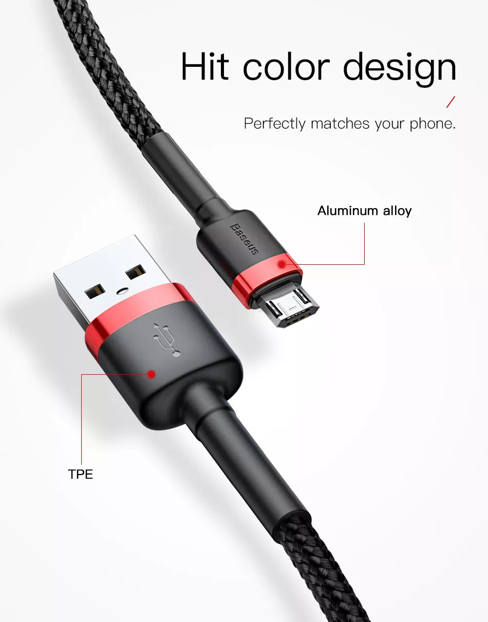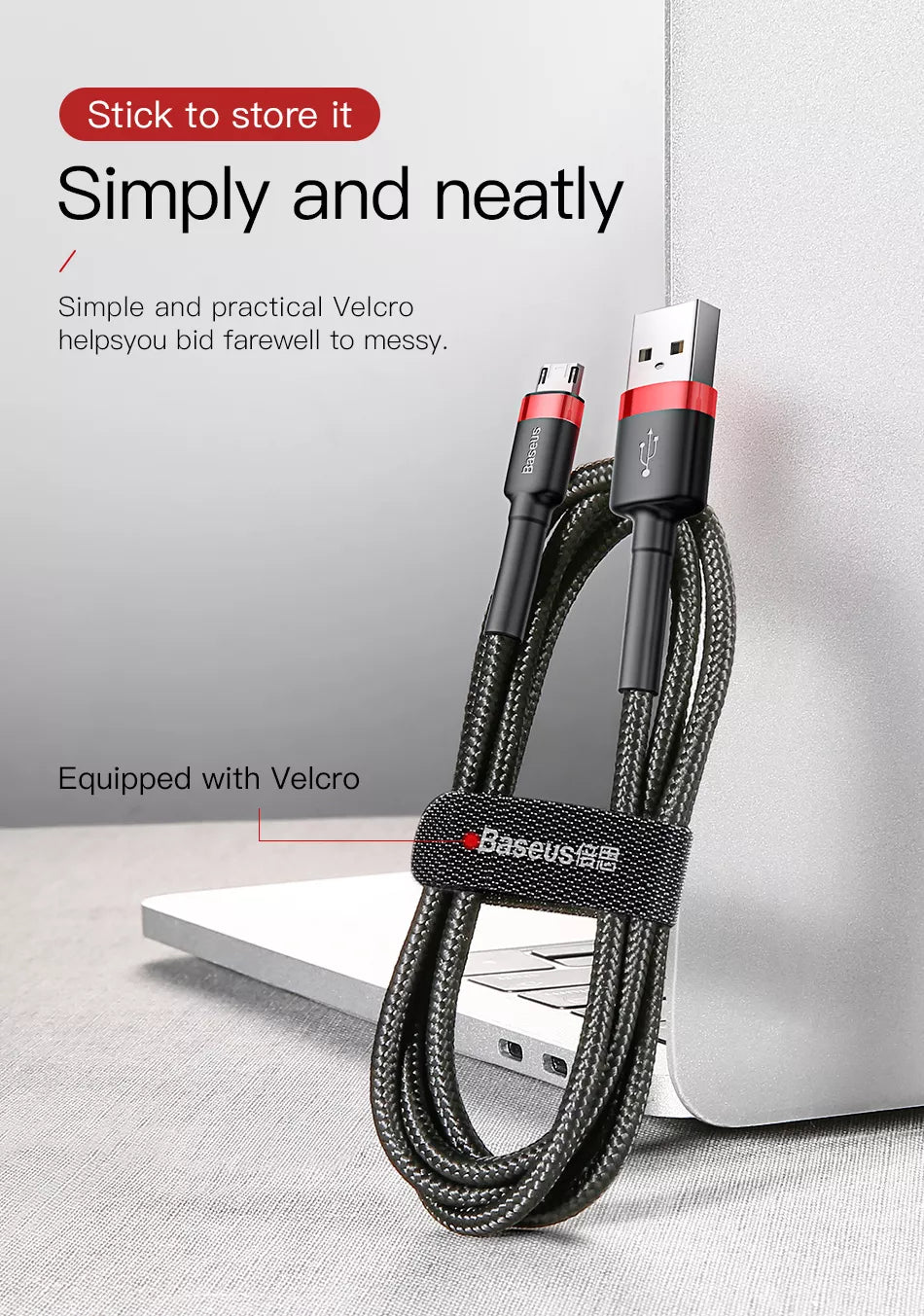 Baseus cable with a reinforced construction. It supports fast charging and data exchange up to 480Mb/sec (e.g. with a computer). With a two-sided Micro USB connector, we do not have to worry while plugging the cable into the device. The control chipset adjusts the current to the device, protecting it from damage. The nylon braid strengthens the cable and prevents it from tangling. A Velcro strap is included for easy cable storage.