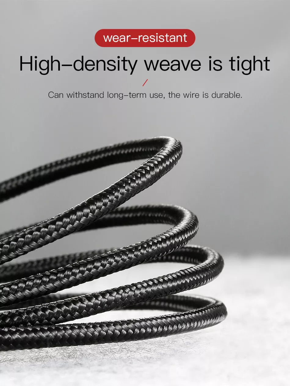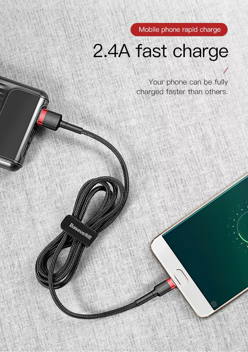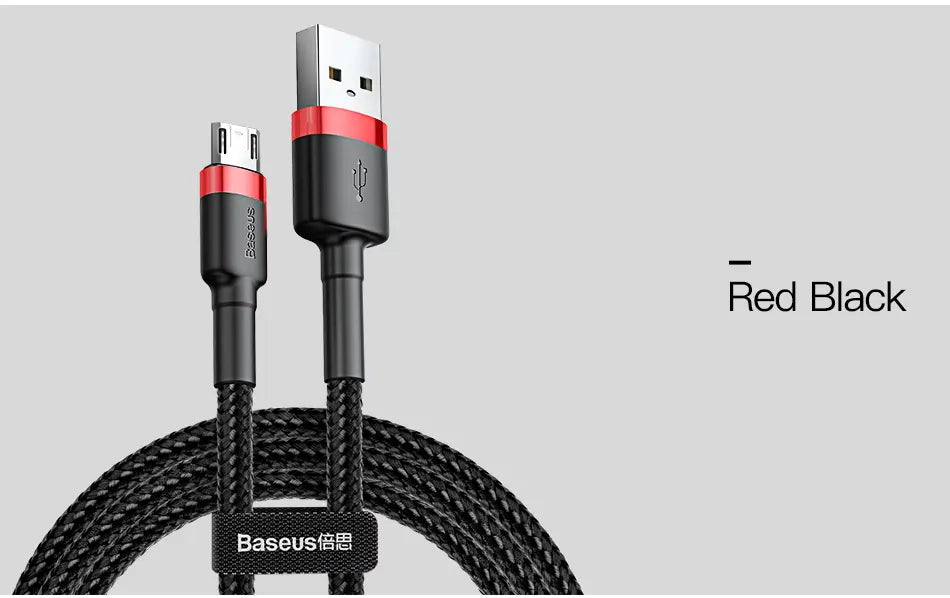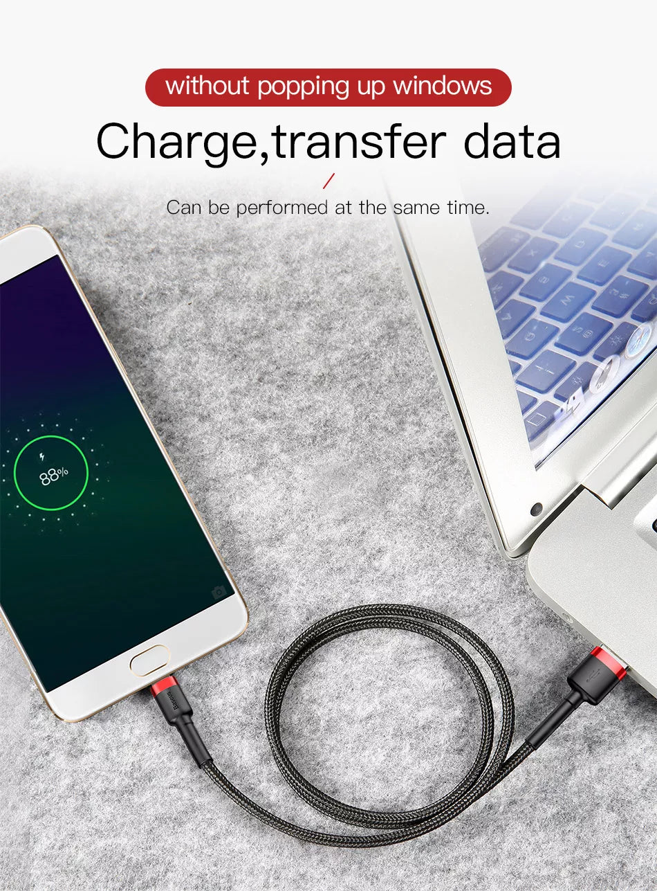 Baseus cable with a reinforced construction. It supports fast charging and data exchange up to 480Mb/sec (e.g. with a computer). With a two-sided Micro USB connector, we do not have to worry while plugging the cable into the device. The control chipset adjusts the current to the device, protecting it from damage. The nylon braid strengthens the cable and prevents it from tangling. A Velcro strap is included for easy cable storage.